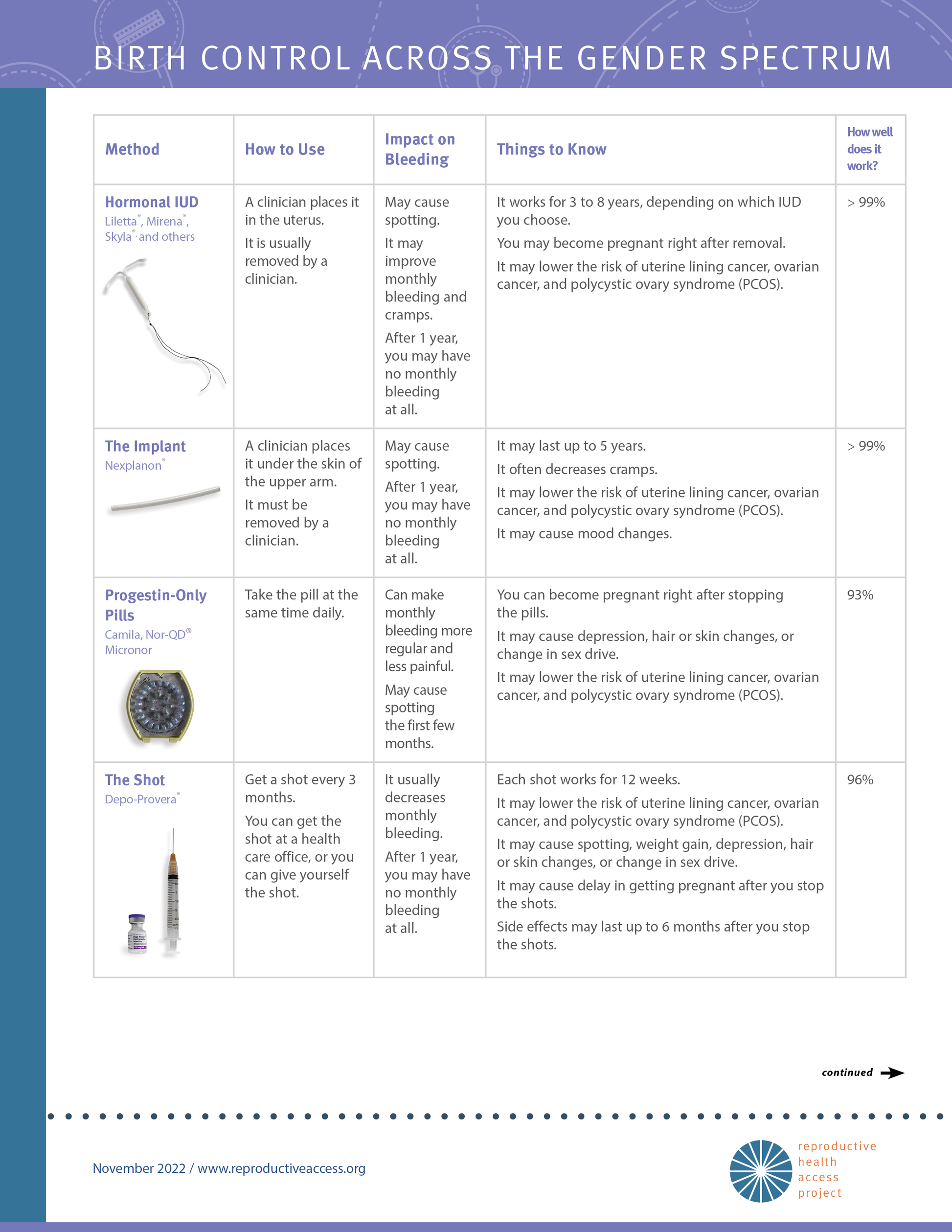 Birth Control Across the Gender Spectrum This resource explains different birth control methods for people across the gender spectrum, with a focus on the effects of different forms of birth control on those taking gender-affirming hormones such as testosterone.