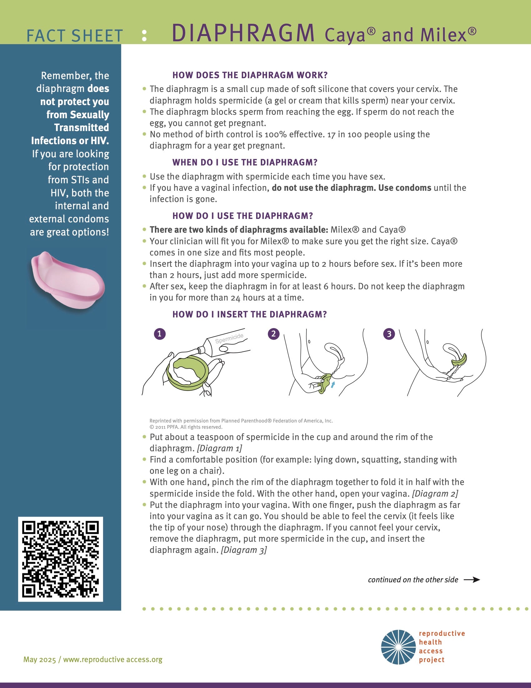 Your Birth Control Fact Sheet This patient fact sheet compares different birth control choices in a colorful and easy-to-read chart. The methods are organized alphabetically. The sheet includes essential information about each method, how to use, impact on bleeding/menstruation, along with common side effects.
