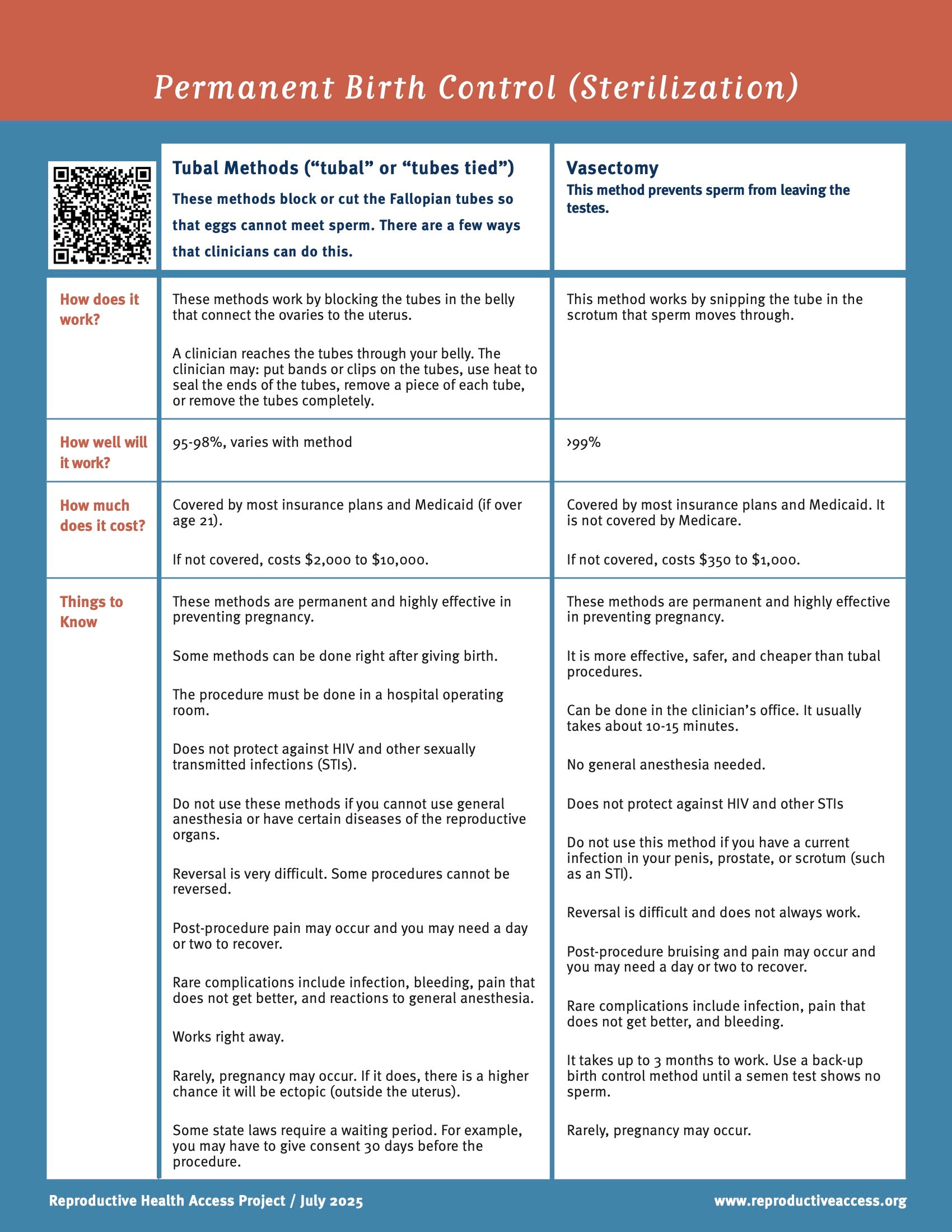 Permanent Birth Control (Sterilization) Fact Sheet This patient fact sheet explains permanent birth control (Sterilization) options for men and women. Compares methods based on efficacy. Lists average cost and outlines pros and cons of different methods.