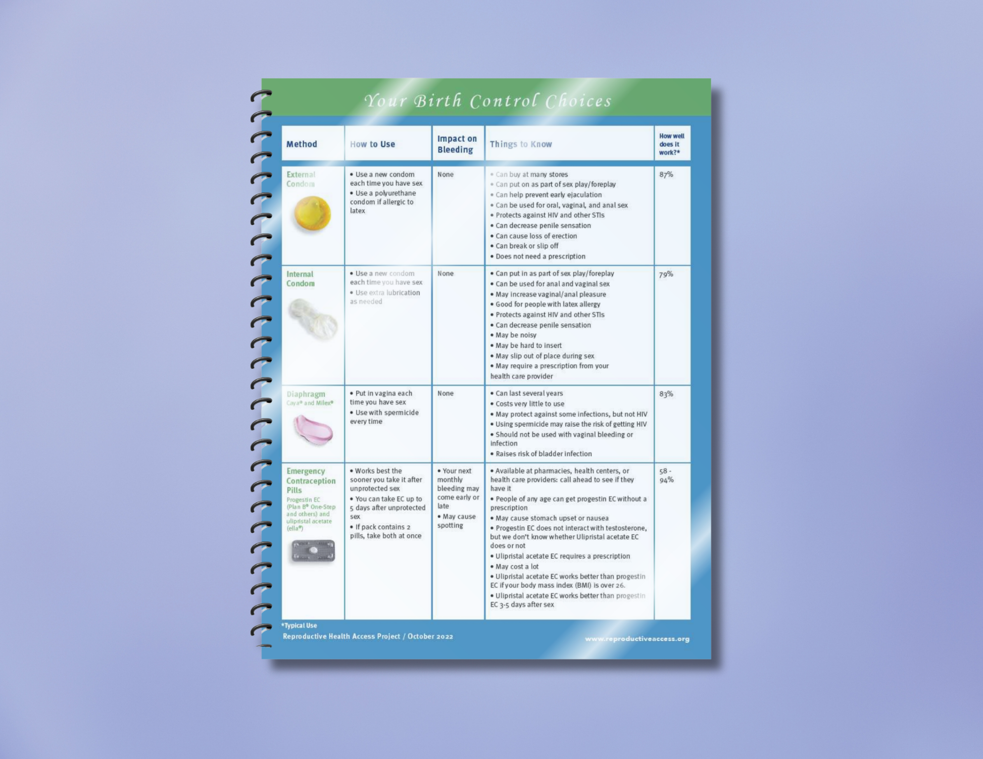Birth Control Choices for People Assigned Male at Birth This colorful and easy-to-read chart compares birth control choices for people assigned male at birth. The sheet explains how to use different methods, things to know, and how well each method works. Ideal for health centers, doctor’s offices, and school clinics.